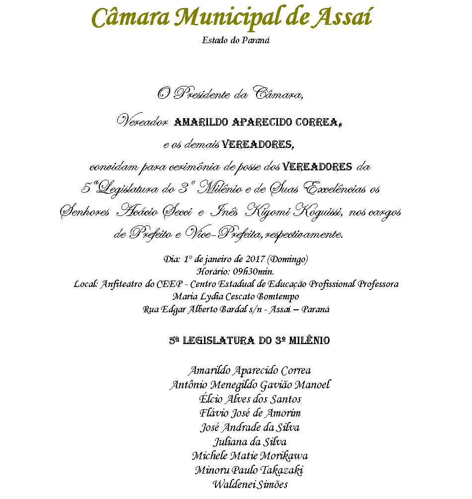 Convidamos a todos para cerimônia de posse dos VEREADORES