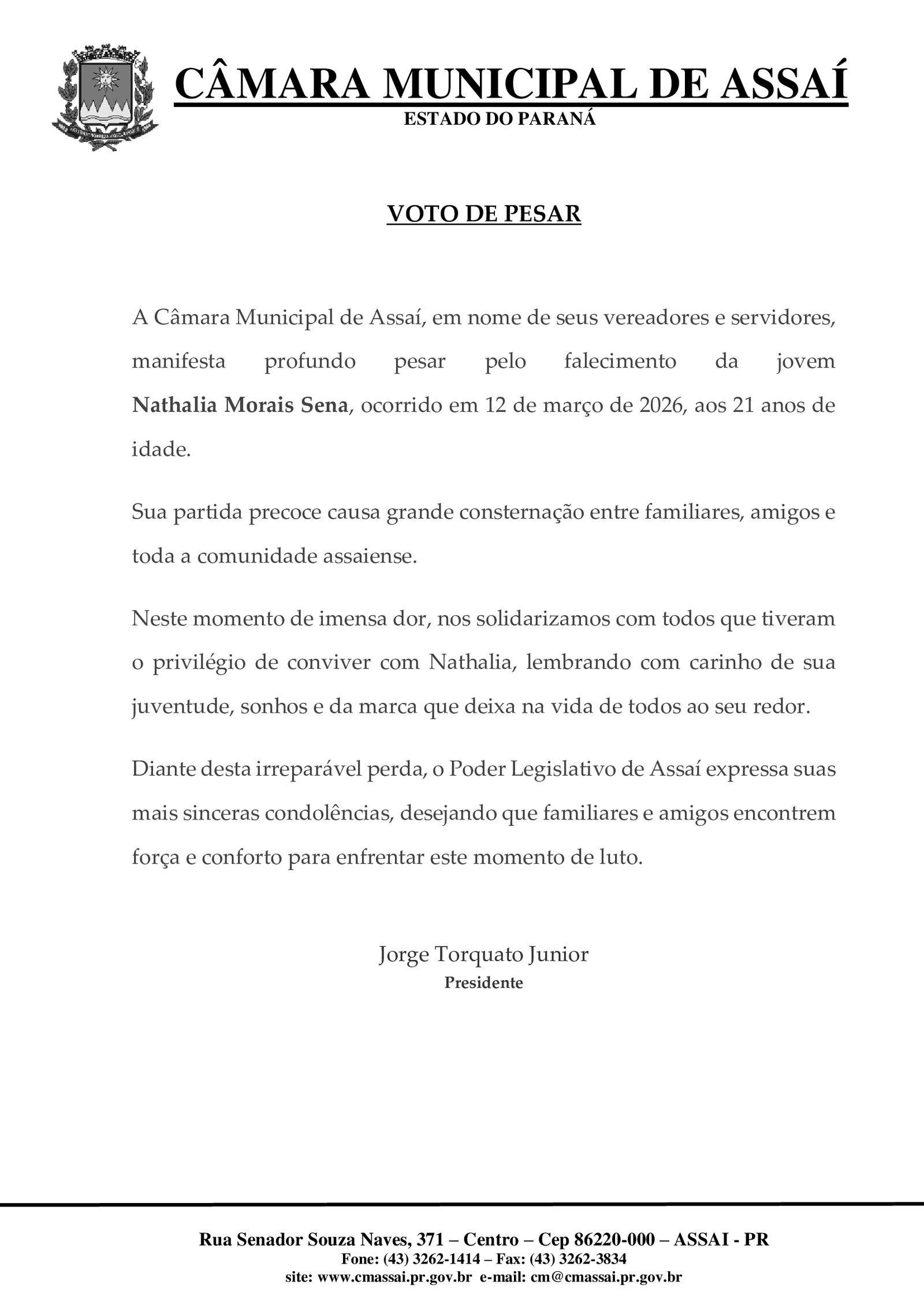Voto de Pesar pelo falecimento de Nathália Sena
