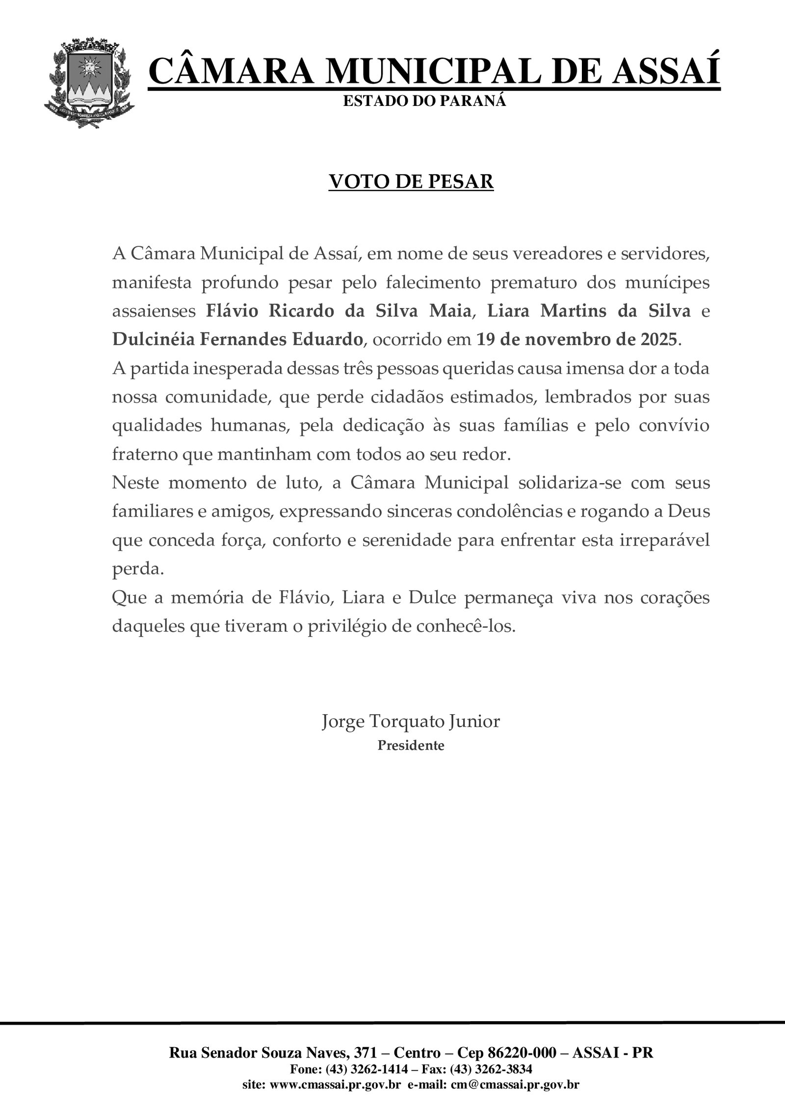 Voto de Pesar pelo falecimento de Flávio Maia, Liara Martins e Dulce Eduardo